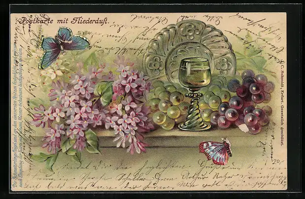 Duft-AK Flieder liegt mit Weintrauben auf einem Tisch