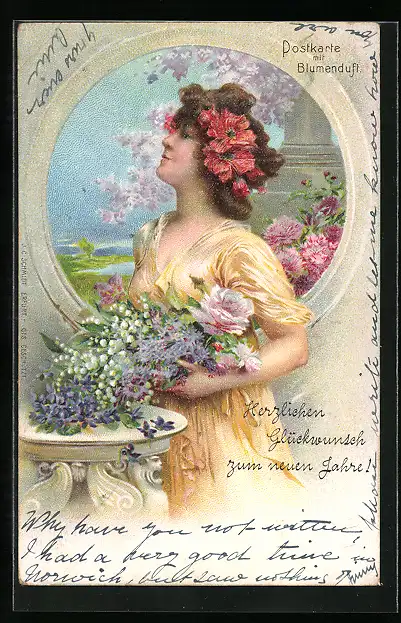 Duft-AK Frau mit Blumen riecht den Blumendurft in der Luft