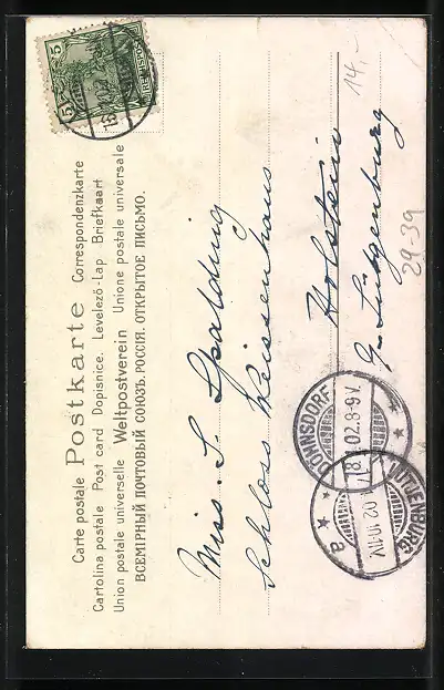 Personenbezogene Daten auf der Rückseite der Karte wurden durch blauen Textmarker unkenntlich gemacht. Die blauen Stellen sind auf die Vorderseite durchgeweicht und wirken sich negativ auf das Postkartenfoto aus
