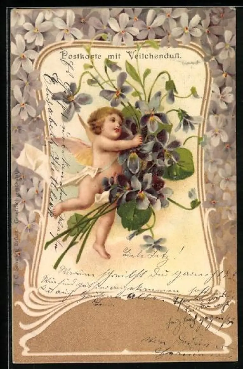 Duft-AK Kleiner Engel mit einem Veilchenstrauss