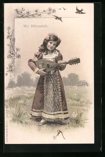 Duft-AK Mädchen mit Laute auf einer Wiese