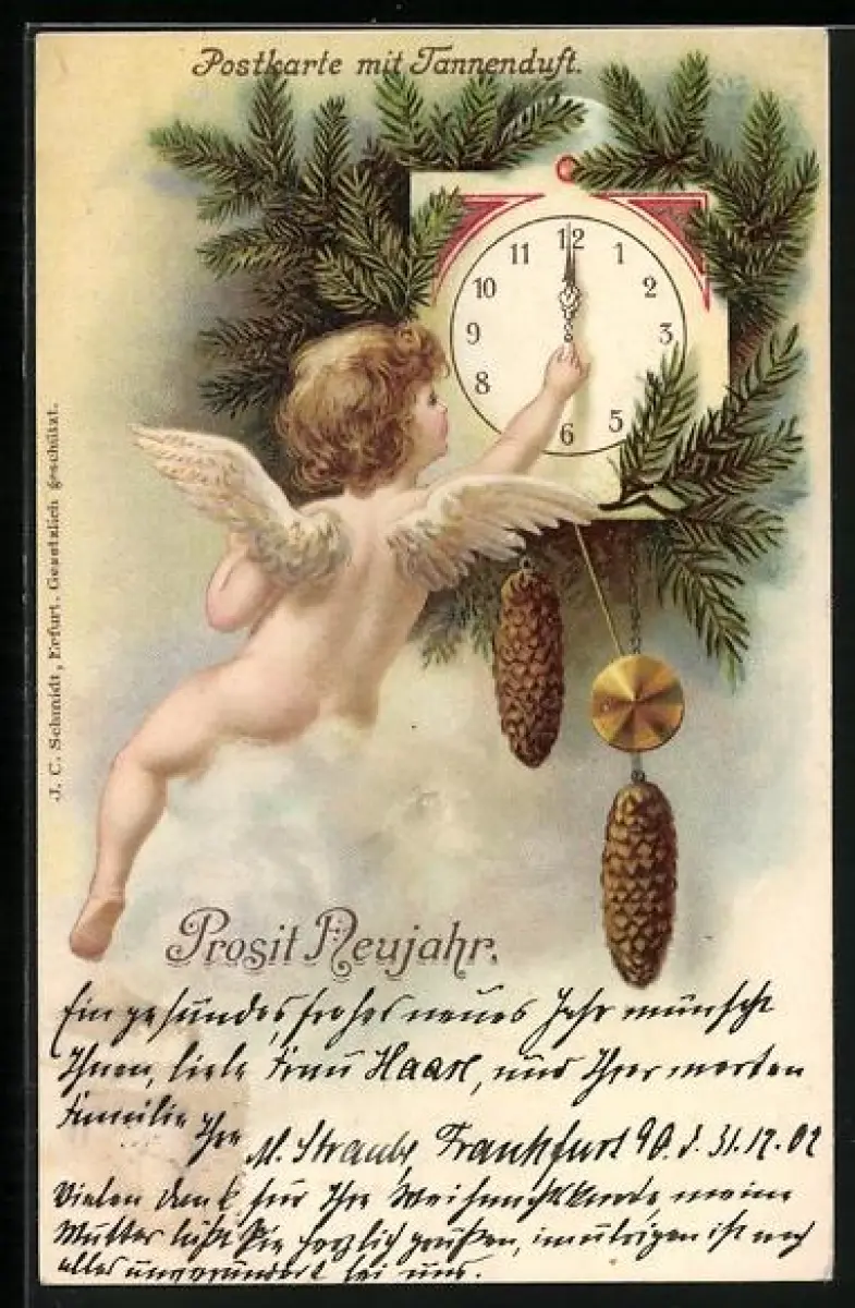 Duft-AK Nackter Engel verstellt die Uhr, Karte mit Tannenduft, Prosit Neujahr