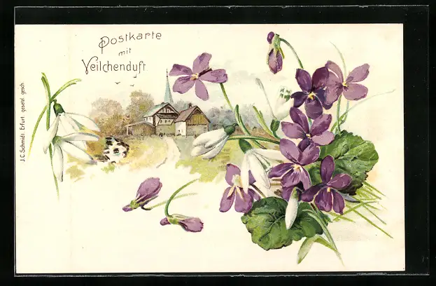 Duft-AK Veilchenstrauss, Ortsansicht mit Kirche, mit Duft