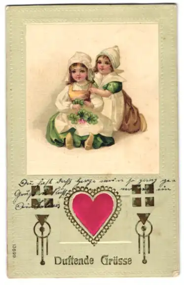 Duft-AK Zwei junge Mädchen in Tracht mit Glücksklee, darunter ein duftendes Herz