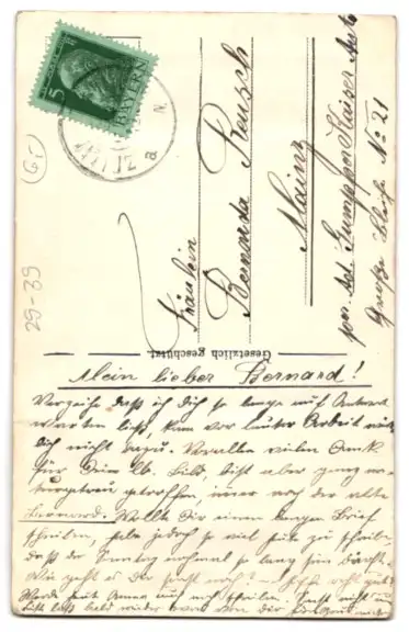 Personenbezogene Daten auf der Rückseite der Karte wurden durch blauen Textmarker unkenntlich gemacht. Die blauen Stellen sind auf die Vorderseite durchgeweicht und wirken sich negativ auf das Postkartenfoto aus