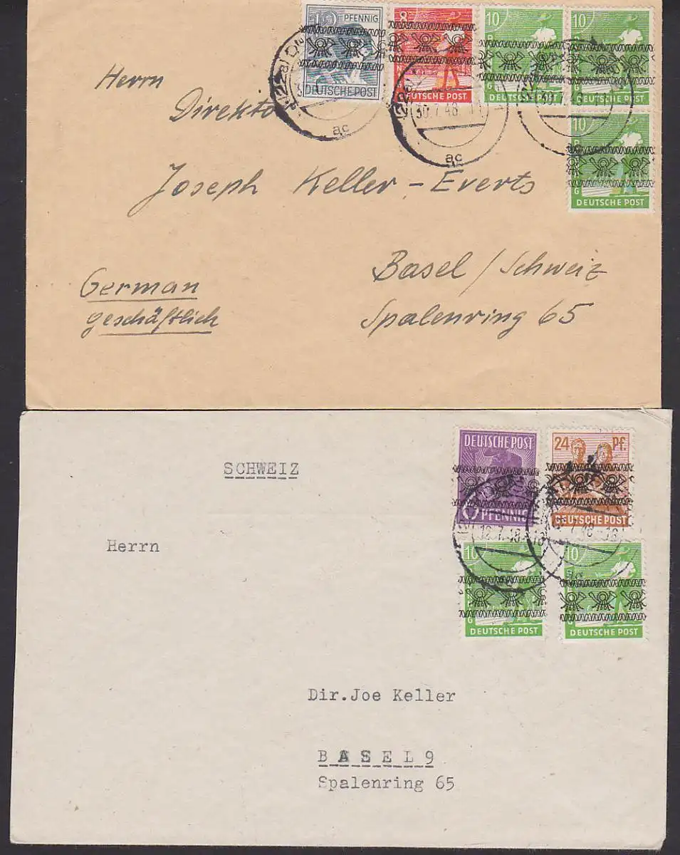 Duisburg zwei Auslandsbriefe nach Basel / Schweiz mit Leistenaufdruck, portogenau