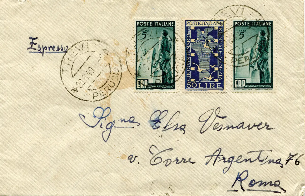 E.R.P. Lire 5 Nr. 601 zwei Exemplare + Ergänzung Nr. 597 auf Expressumschlag nach Rom am 20.6.49 - im Tarif - Vergilbungspunkte auf dem Umschlag - Kat. euro 465 Cod. 286/15