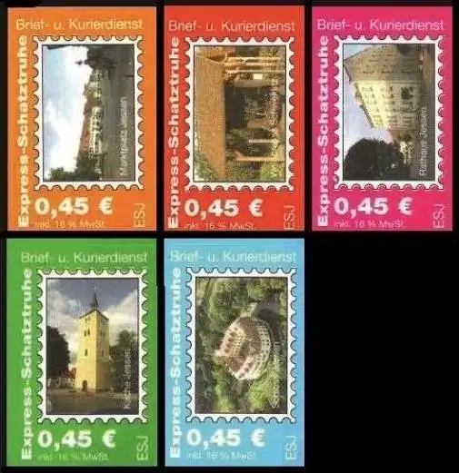 • MichSeite ESJ: MiNr. 1 I - 5 I, 01.03.2005, "Sehenswürdigkeiten", Satz, postfrisch Beschreibung \nAusgabeland: Bundesrepublik Deutschland \nPostdienstleister: Express-Schatztruhe (ESJ), Jessen (Elster) \nAusgabeanlass: Briefmarkenausgabe "Sehenswürdigkeiten: Marktplatz, Kirche, Rathaus, Weinpresse Schwanitz, Schloss" Katalognummer: MiNr. 1 I - 5 I Ausgabedatum: 01.03.2005 Nominale: Satz (5 Werte) zu je 0,45 EUR \nTyp: I (lange Inschrift 33 mm) \nErhaltung: selbstklebend, gerade gezähnt, postfrisch \nHinweis: -