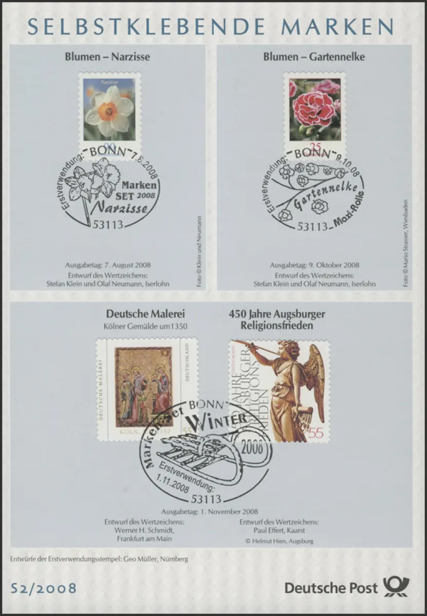 Blumen -Narzisse / Gartennelke, Deutsche Malerei, Augsburger Religionsfrieden, Wohlfahrt - A380, Blumen - Gartenrose, Leuchttürme Hörnum und Amrum, Michel-Nrn. 2515, 2675, 2676, 2682-2683, 2699, 2700-2701