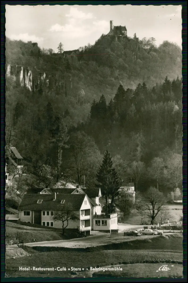 Schwarzweiß Ansichtskarte aus den 1960er Jahren, unbeschrieben und gut erhalten. Zeigt den Luftkurort Behringersmühle mit dem bekannten Hotel-Restaurant-Café Stern, im Vordergrund parkende Fahrzeuge der Nachkriegszeit.