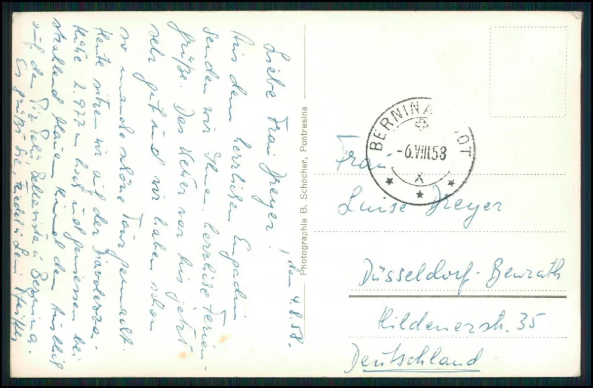 Rückseite: Gelaufen 1958 mit Stempel Bernina Hospiz – 6.VIII.58. Adressiert nach Düsseldorf-Benrath, Deutschland.