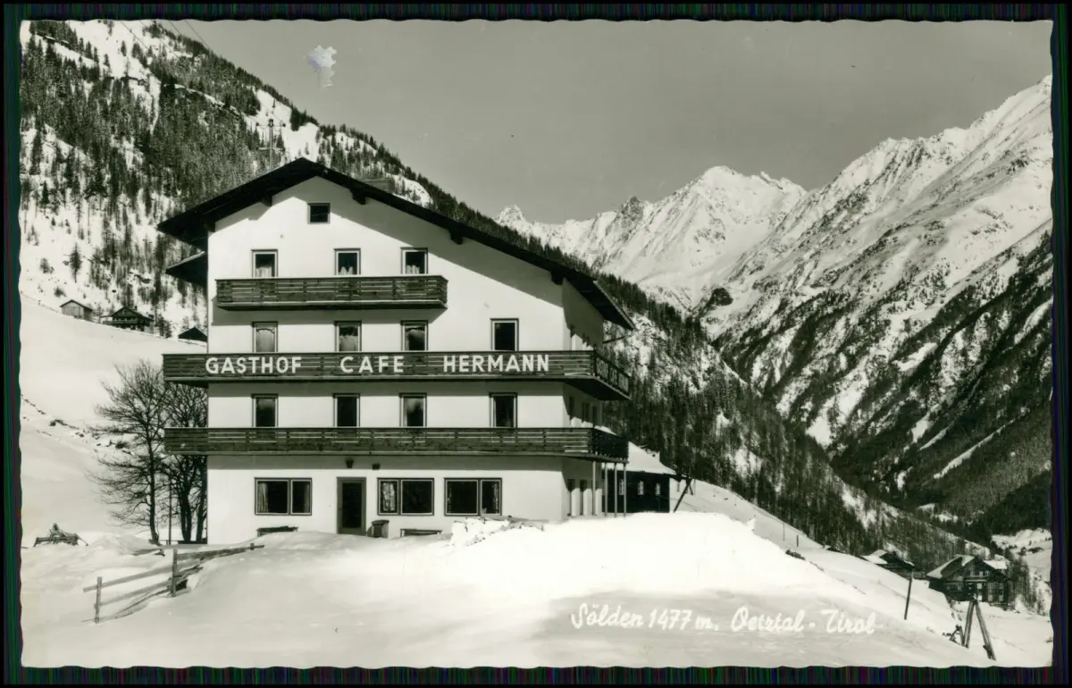 Motiv: Gasthof Café Hermann im verschneiten Winterpanorama, typische alpine Architektur mit Holzverkleidung und Balkonen. Im Hintergrund eindrucksvolle Gipfel der Ötztaler Bergwelt.