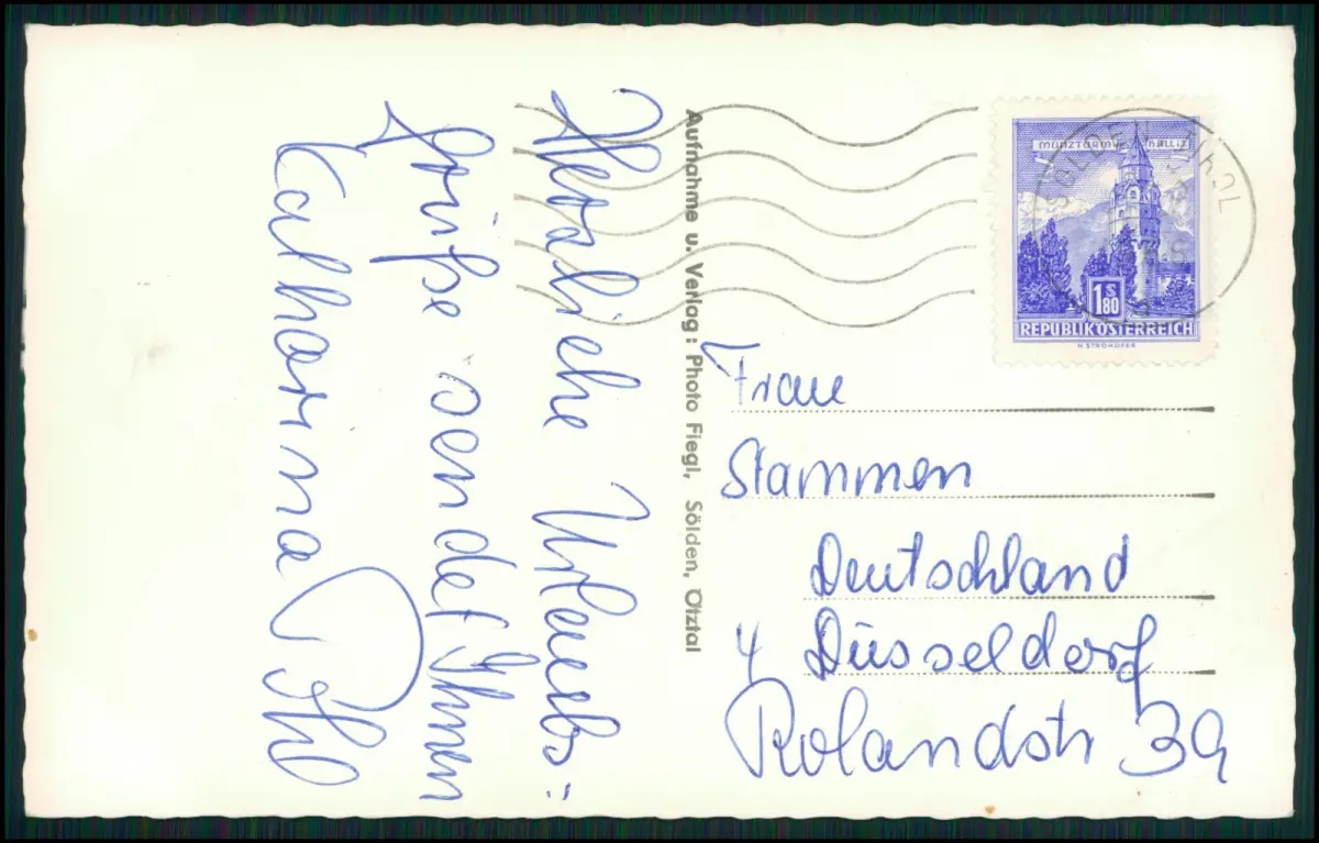 Rückseite: Handschriftliche Grüße nach Düsseldorf mit österreichischer Briefmarke 1,80 Schilling, Motiv Münzerturm Hall in Tirol.