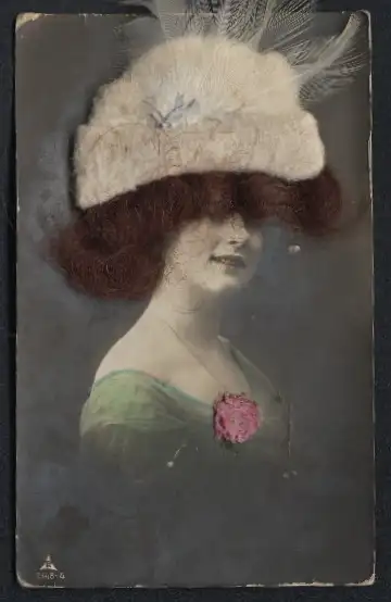 Echt-Haar-AK Dame mit federgeschmücktem Hut