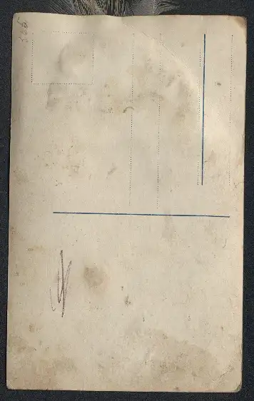 Personenbezogene Daten auf der Rückseite der Karte wurden durch blauen Textmarker unkenntlich gemacht. Die blauen Stellen sind auf die Vorderseite durchgeweicht und wirken sich negativ auf das Postkartenfoto aus