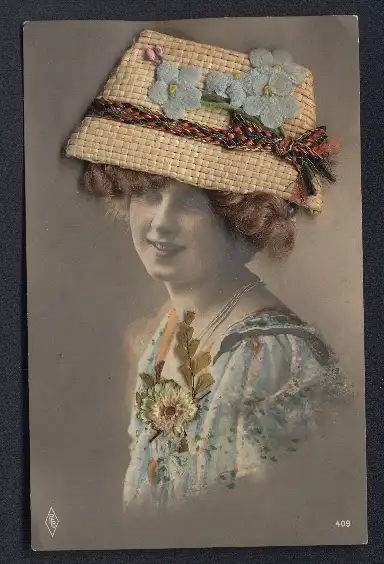 Echt-Haar-AK Eine junge Frau mit echtem Haar und Hut aus Stoff