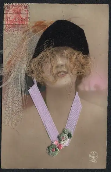 Echt-Haar-AK Junge Frau mit Federschmuck