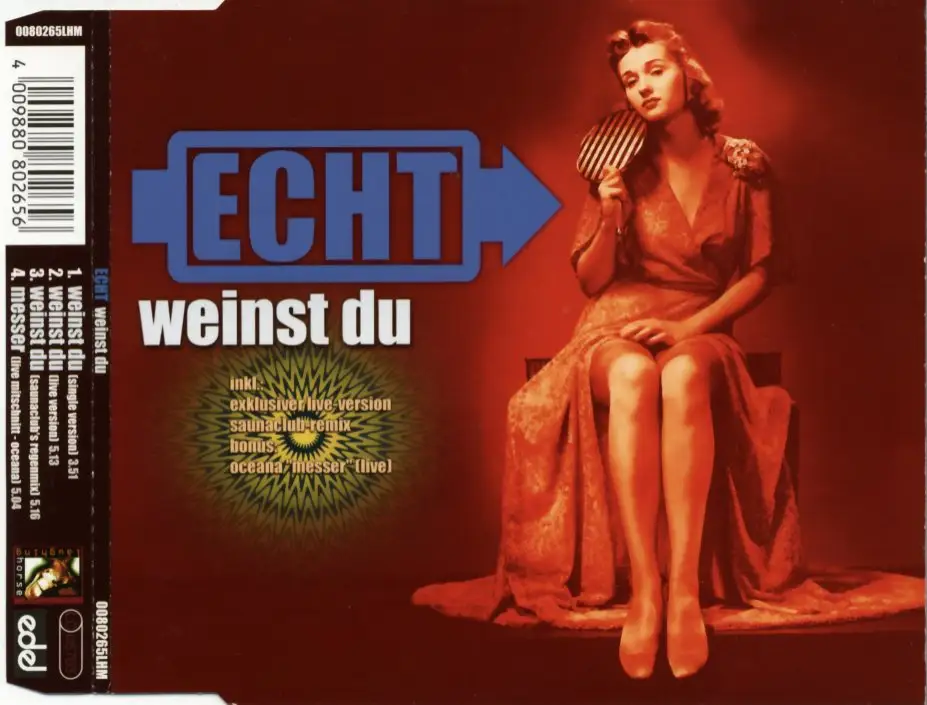CD Single Echt - Weinst Du, Zustand CD VG Hülle M-; 1999 Laughing Horse 0080265 LHM, Tracks Single Vers. 3:51, Live Vers. 5:13, Saunaclub's Regenmix 5:16, Meser [Live Mitschnitt - Oceana] 5:04
