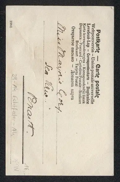Personenbezogene Daten auf der Rückseite der Karte wurden durch blauen Textmarker unkenntlich gemacht. Die blauen Stellen sind auf die Vorderseite durchgeweicht und wirken sich negativ auf das Postkartenfoto aus