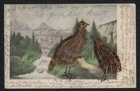 Echtfeder-AK Zwei Rebhühner aus echten Federn an einem Bach