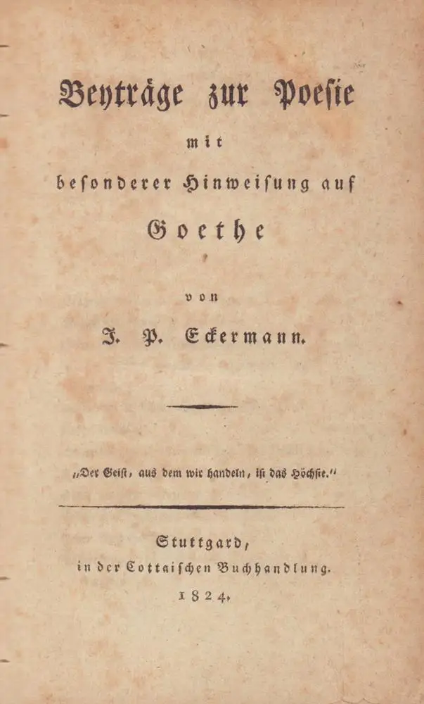 Erste Ausgabe der zweiten Publikation Eckermanns. Sie wurde Anlaß für Eckermanns Umzug nach Weimar, nachdem er Goethe 1823 das Manuskript seiner "Beyträge" gesandt und eine positive Resonanz erhalten hatte. Sie enthalten Kapitel u.a. über: Natur und Kunst in der Poesie, den Tadel poetischer Charaktere, Kritiker, die Zeit poetischer Produktion, den poetischen Stoff und Ansichten in Bezug auf die poetische Form. Obwohl sich nur ein Beitrag direkt auf Goethe bezieht (Bemerkungen über Goethes Wahlverwandtschaften), nehmen doch die meisten Texte Bezug auf seine Werke (u.a. Faust, Clavigo, West-östlicher Divan). Gelegentlich kommt auch Schillers Wirken zur Sprache. - Anfangs gering stockfleckig. Gutes Exemplar