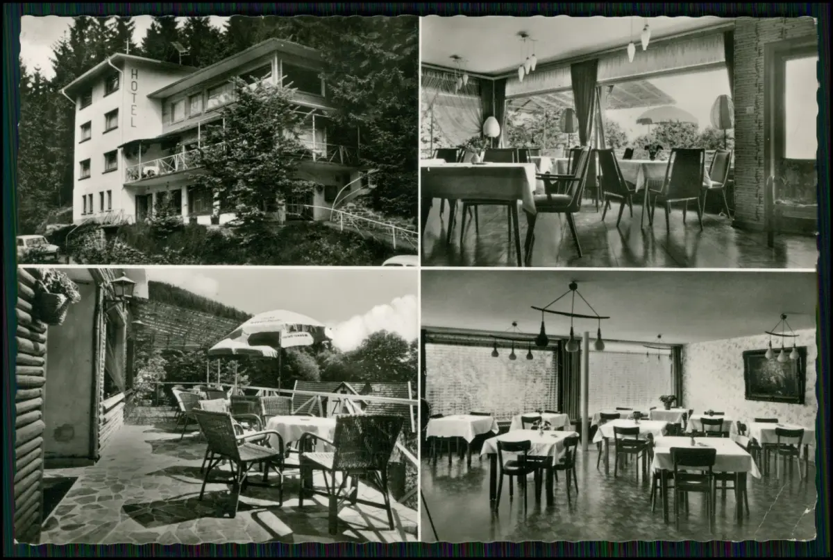Ehrlich – charmante Ortschaft in der Kroppacher Schweiz (Westerwald, Rheinland-Pfalz). Abgebildet ist das Hotel-Pension Sollmann-Schürg, ein typisches Gästehaus der 1960er Jahre mit Terrasse, Speisesaal und gemütlichem Interieur.