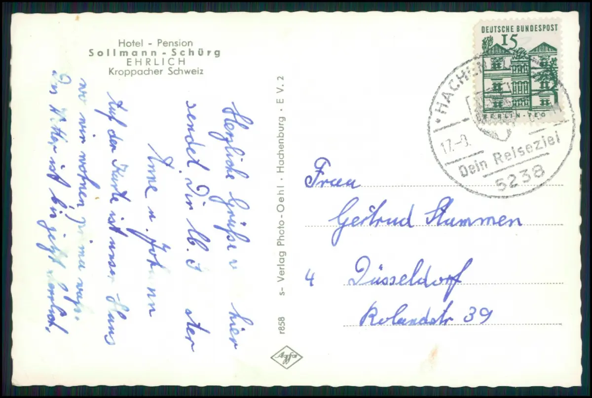 Rückseite: mit handschriftlichem Gruß, Stempel Hachenburg 5238, frankiert mit Deutsche Bundespost 15 Pfennig (Berlin-Bauwerke)