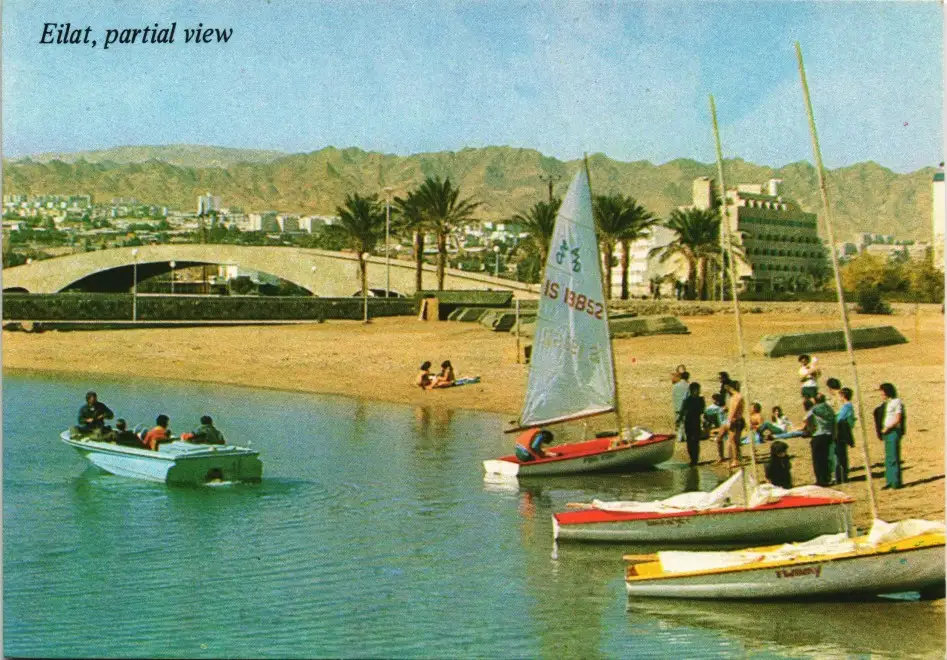Eilat אילת Eilat, partial view, Teilansicht mit Booten am Strand 1975
