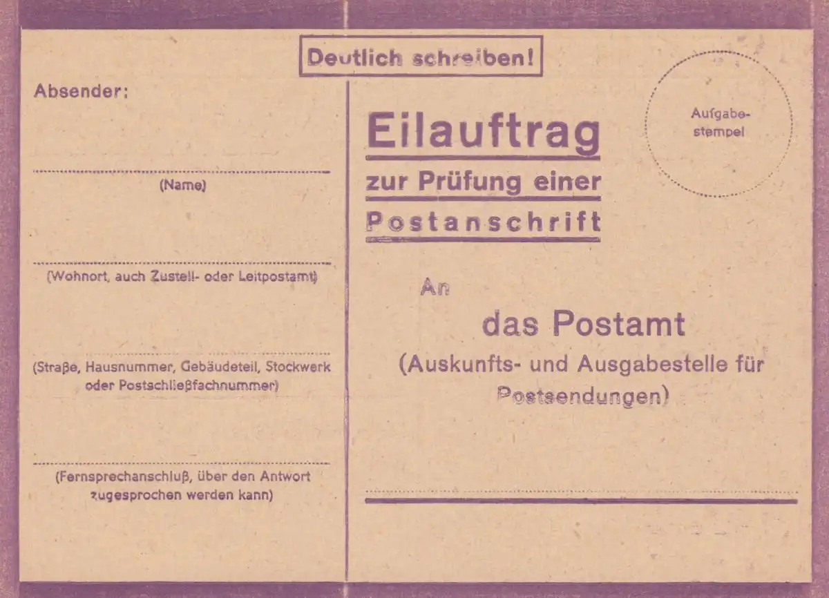 Eilauftrag Prüfung Postanschrift, blanko, 5431 43 2 D