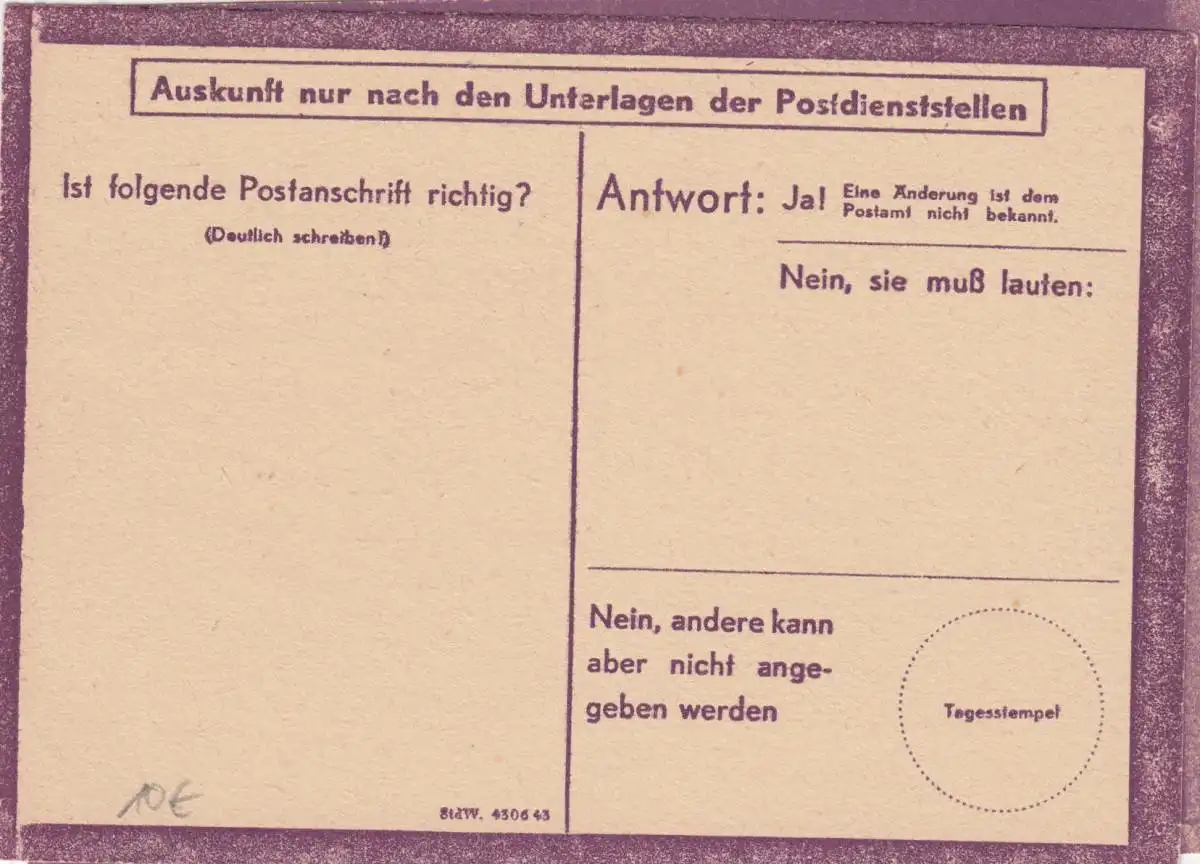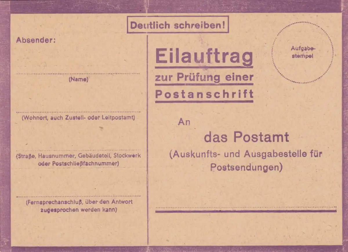 Eilauftrag Prüfung Postanschrift, blanko, StdW. 4306 43