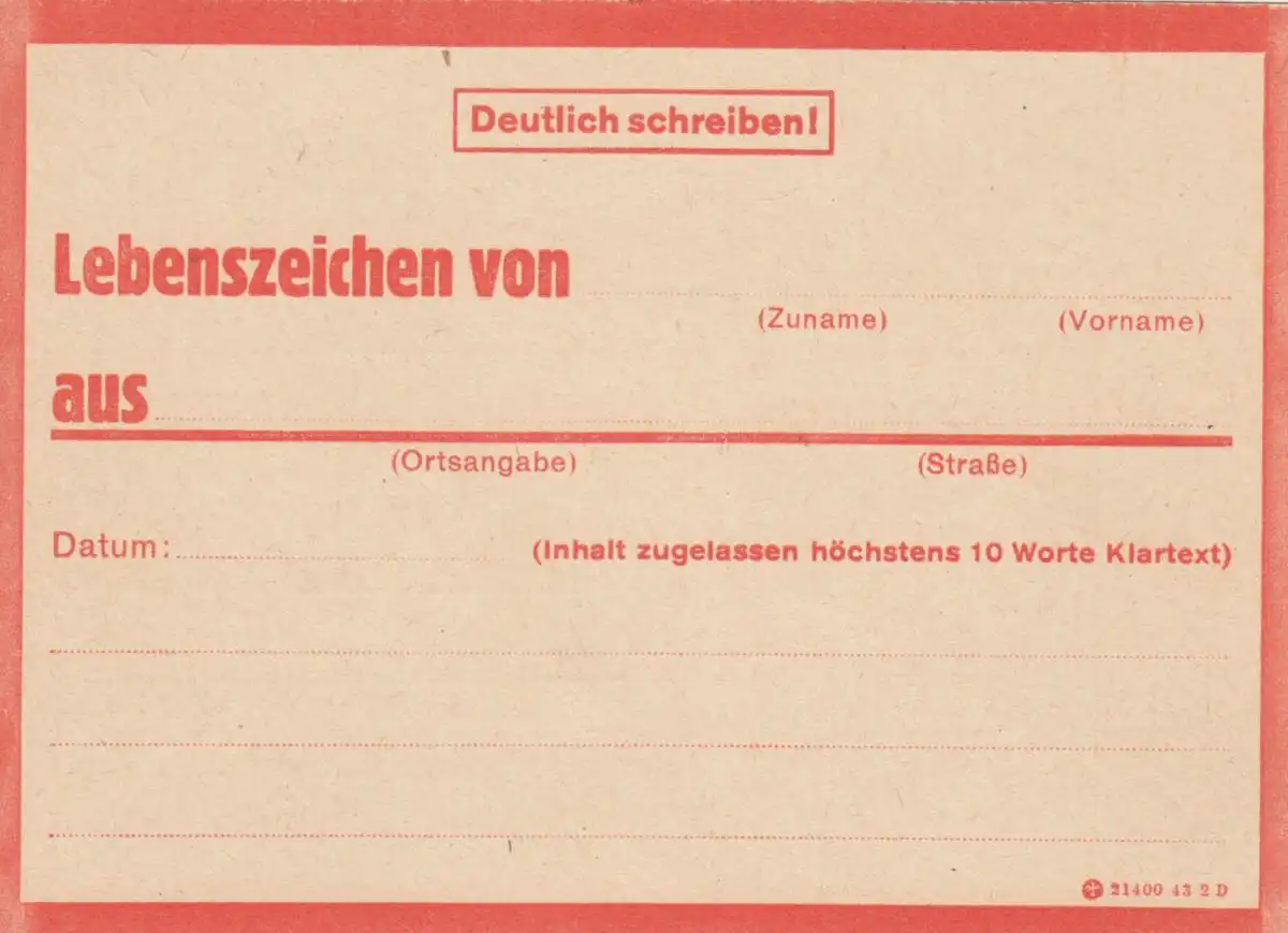 Eilnachricht /Lebenszeichen Postkarte rot, blanko 21400 43 2 D