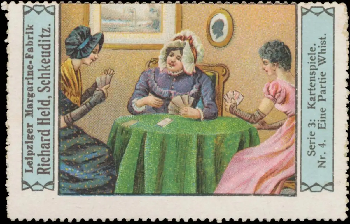 Serie 3: Kartenspiele, Nr. 4, Schkeuditz, Größe/Zustand: 5x7 , leicht beschädigt, Original alte Reklamemarke die seinerzeit für die Werbung benutzt wurde