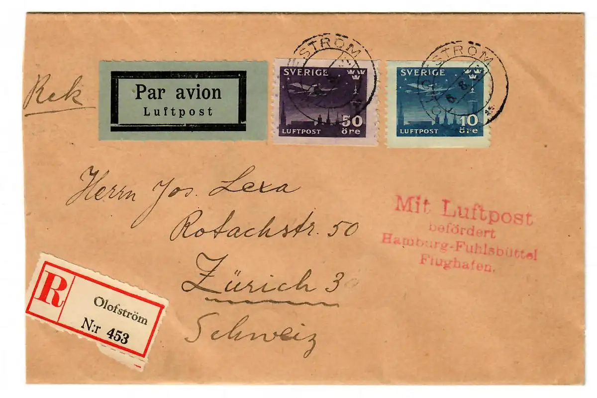 Einschreiben Air Mail Olofström 1932, Luftpost Hamburg-Fuhlsbüttel nach Zürich