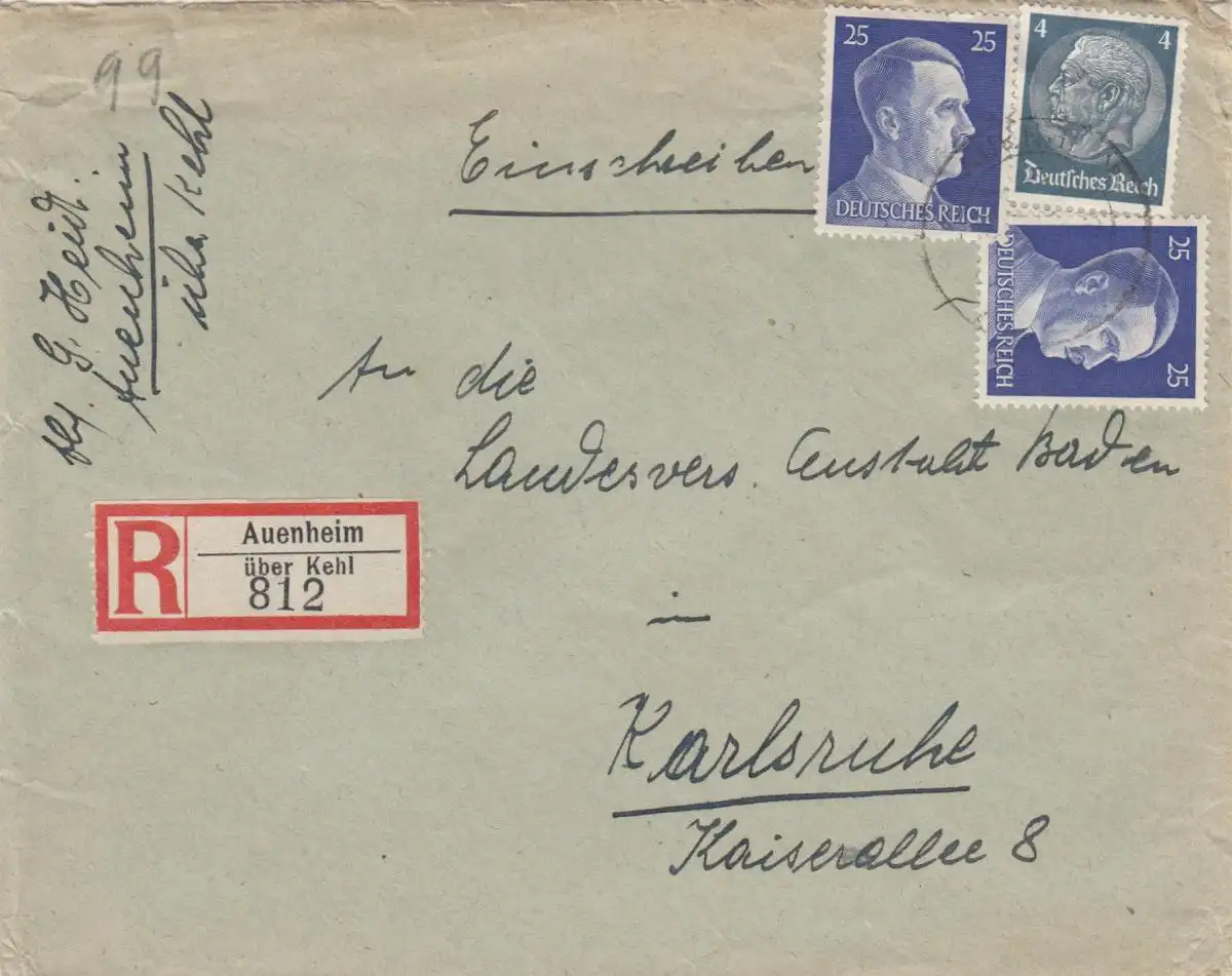 Einschreiben Auenheim über Kehl nach Karlsruhe 1943