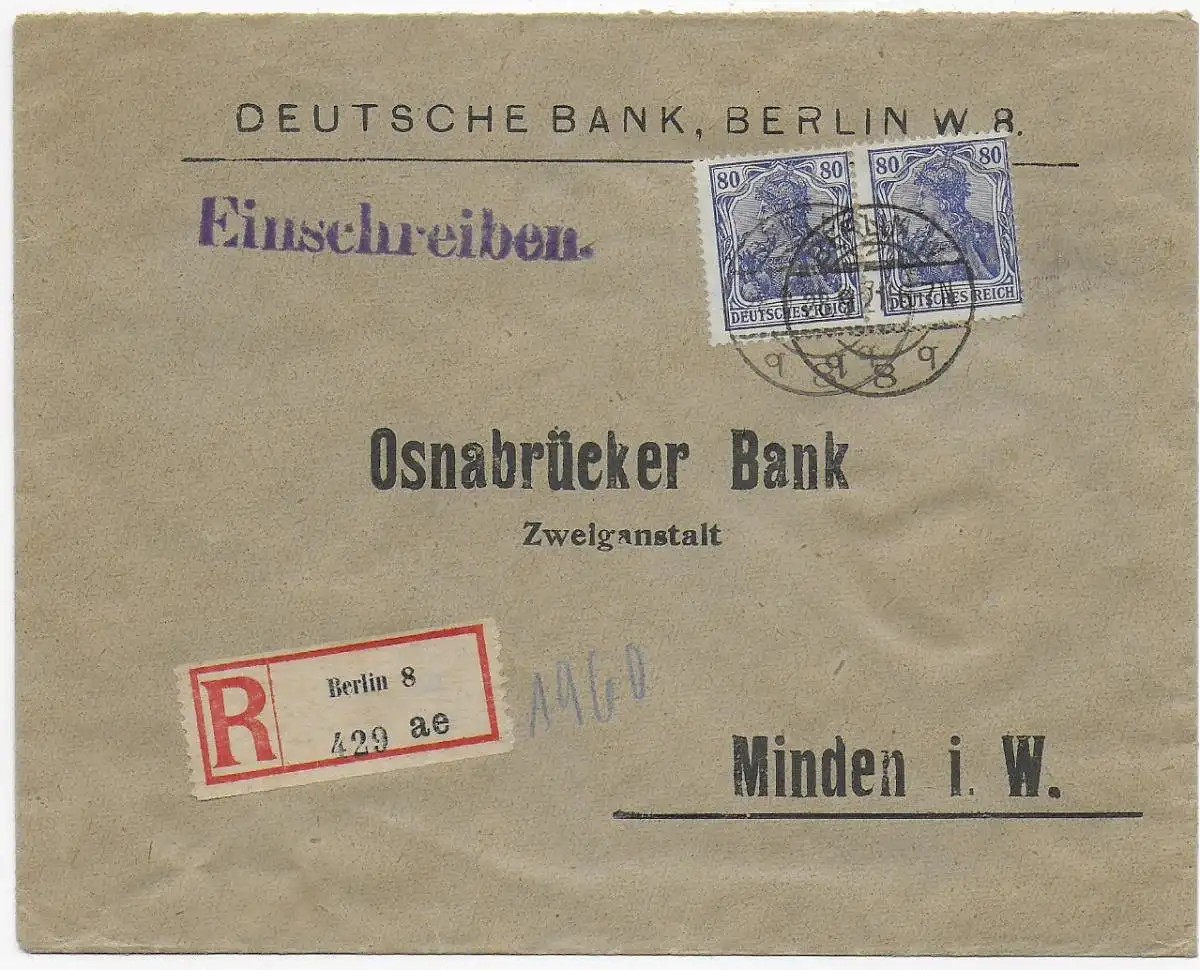 Einschreiben Deutsche Bank Berlin, 1921 nach Minden, stark außerzentrisch