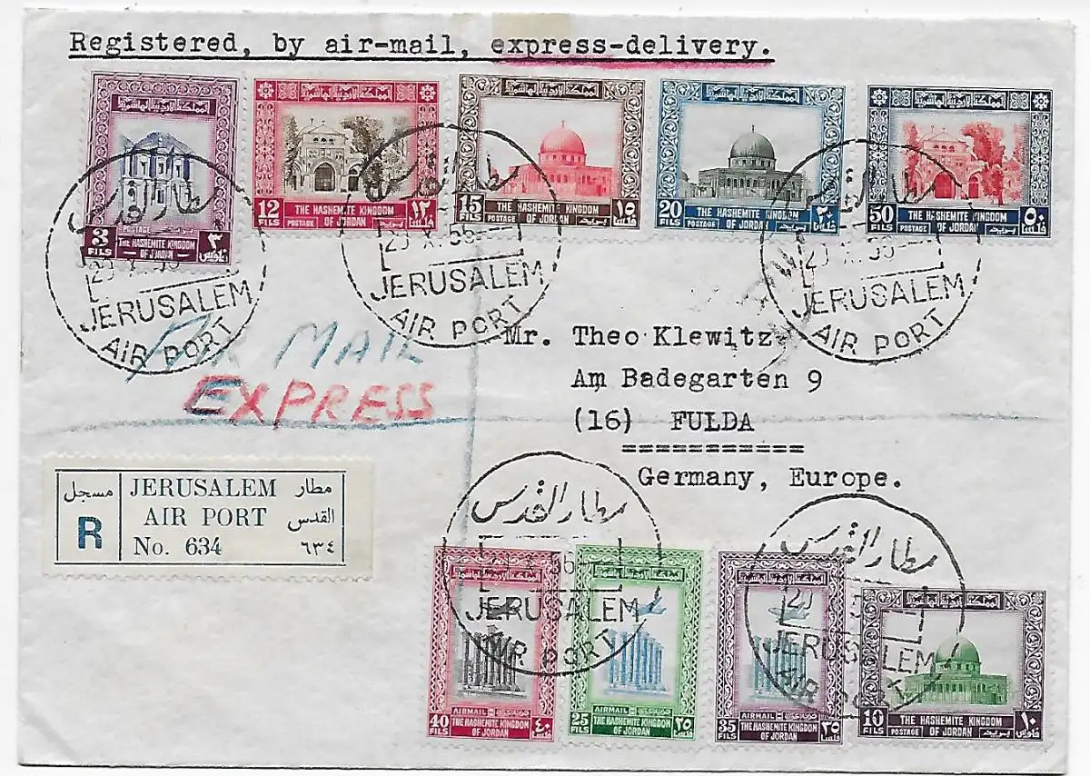 Einschreiben Eilboten Jerusalem airport nach Fulda, 1956