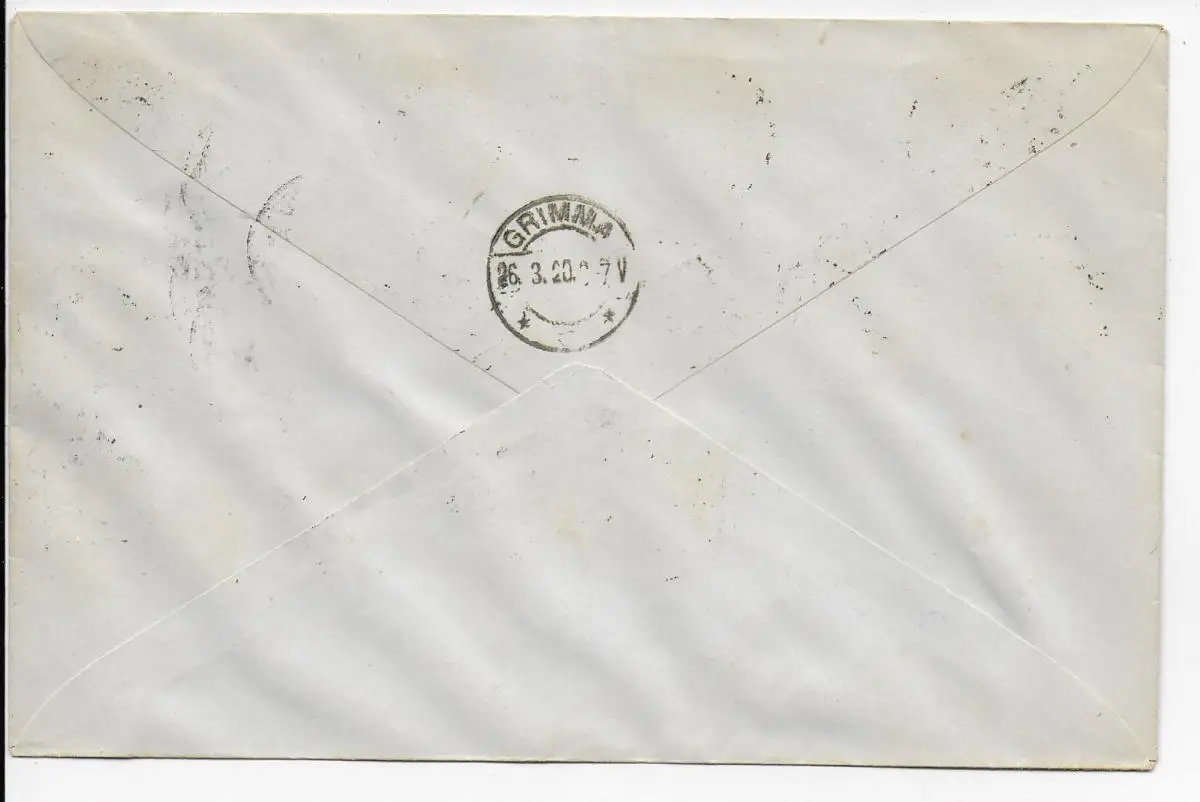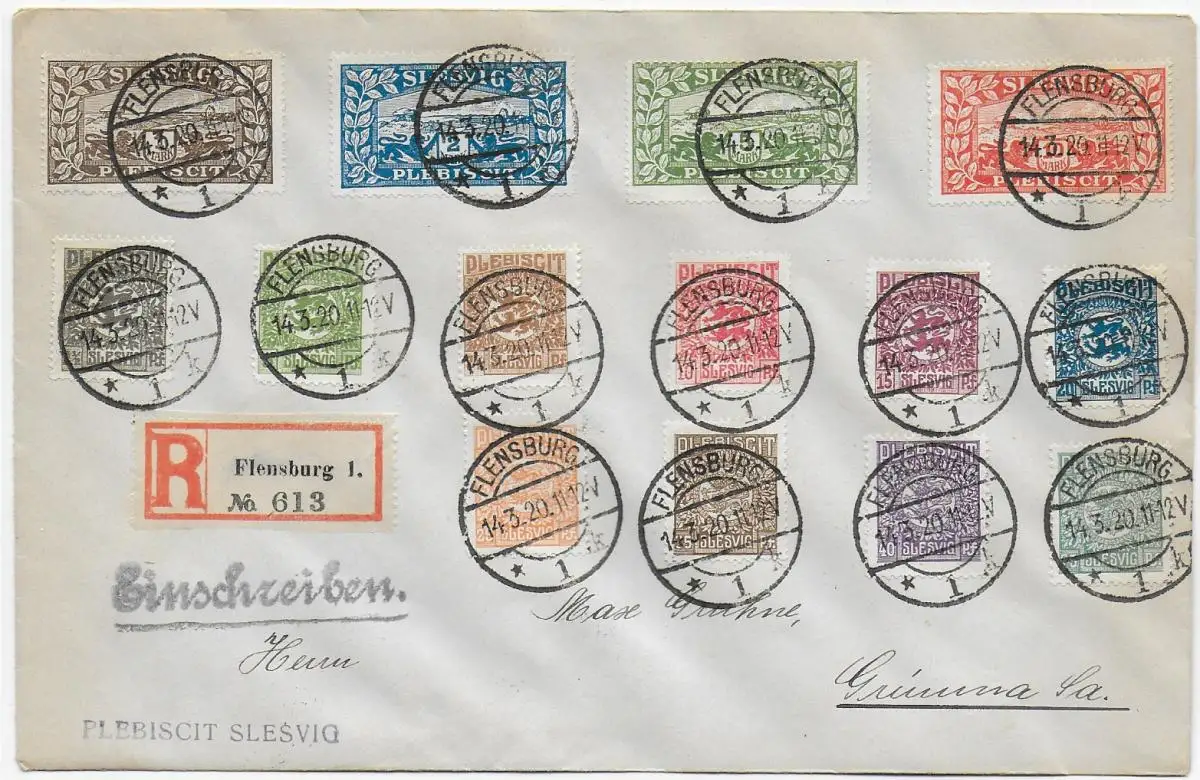 Einschreiben Flensburg MiNr. 1-14 nach Grimma/Sachsen, 1920