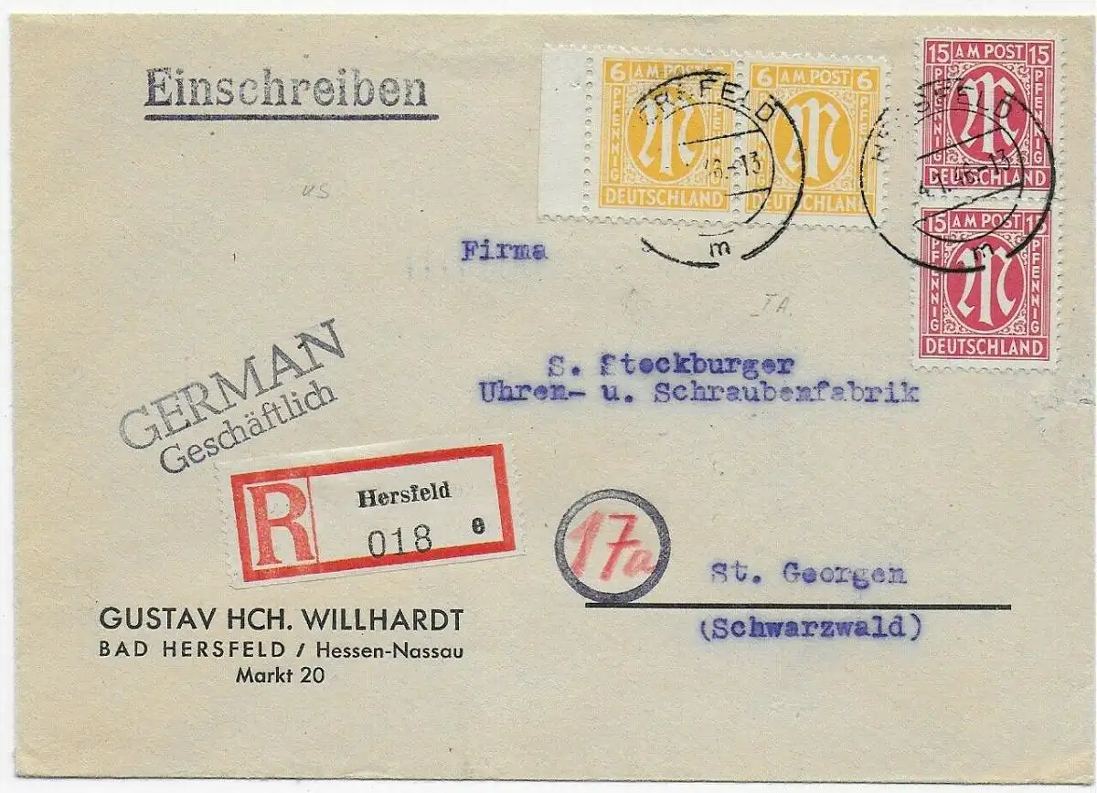 Einschreiben Hersfeld nach St. Georgen, 1946