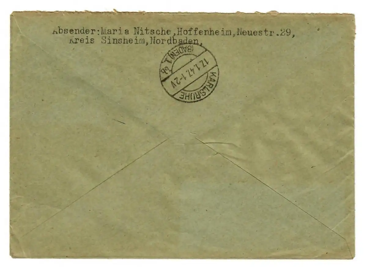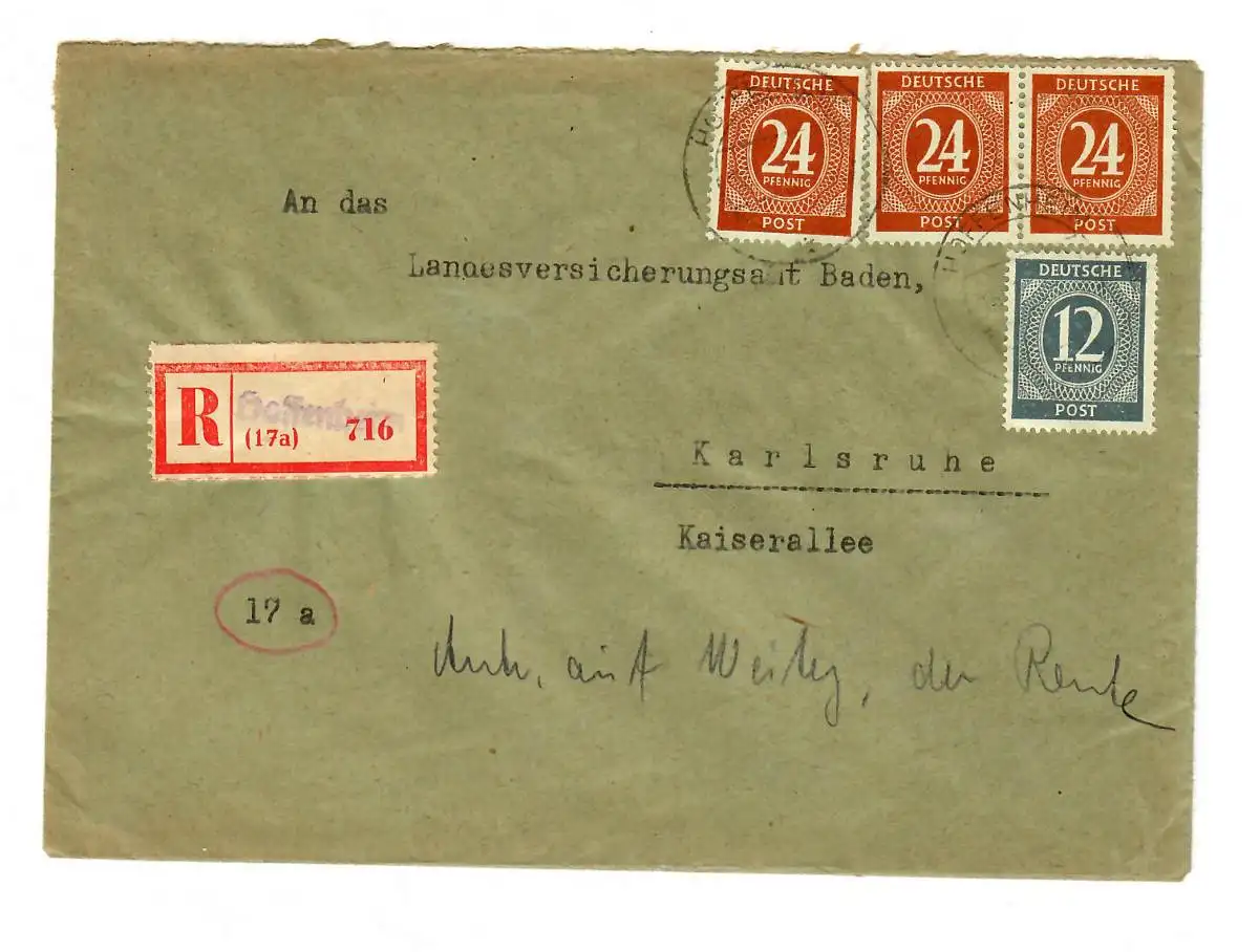 Einschreiben Hoffenheim/Sennsheim/Baden nach Karlsruhe 1947