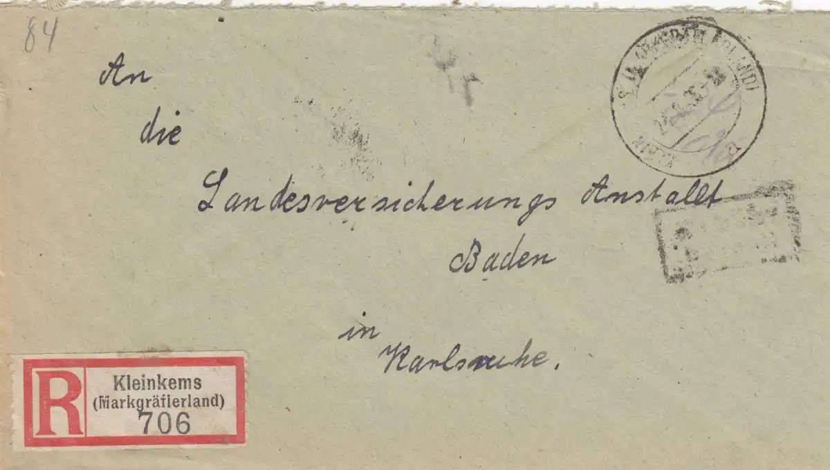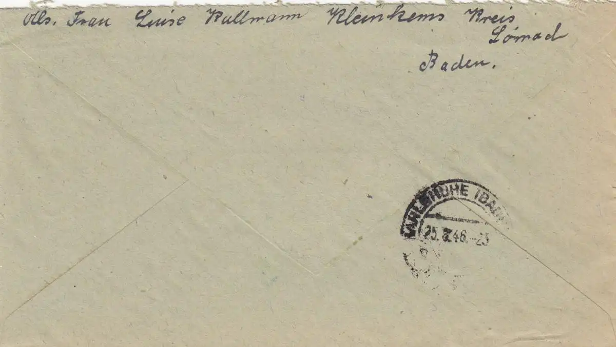 Einschreiben Kleinkrems/Markgräflerland 1946 nach Karlsruhe, Gebühr bezahlt