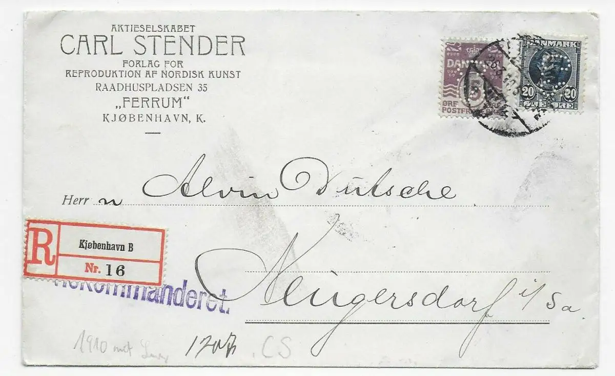 Einschreiben Kopenhagen nach Neugersdorf, 1910, Perfin: Firmenlochung
