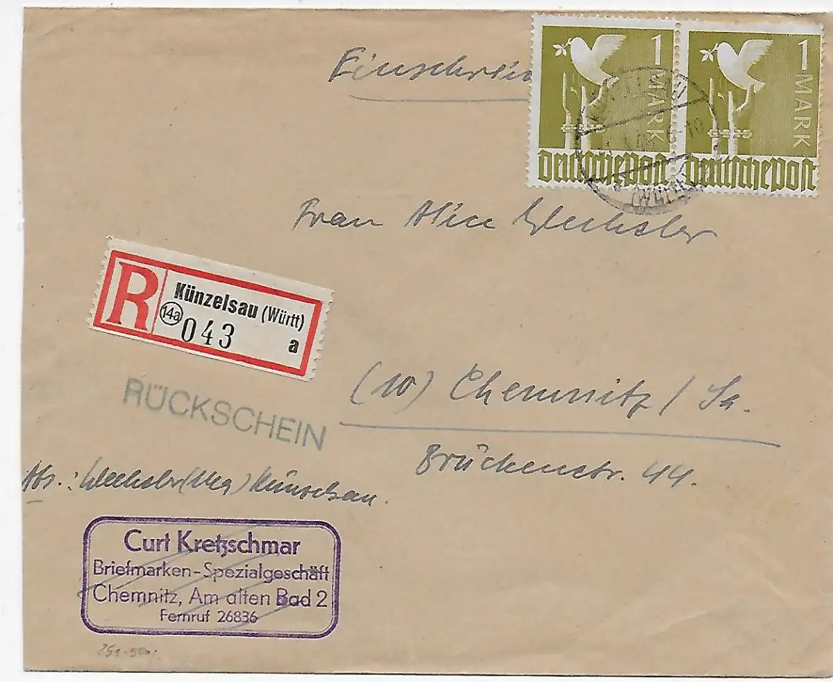 Einschreiben Künzelsau nach Chemnitz mit Rückschein, 1948
