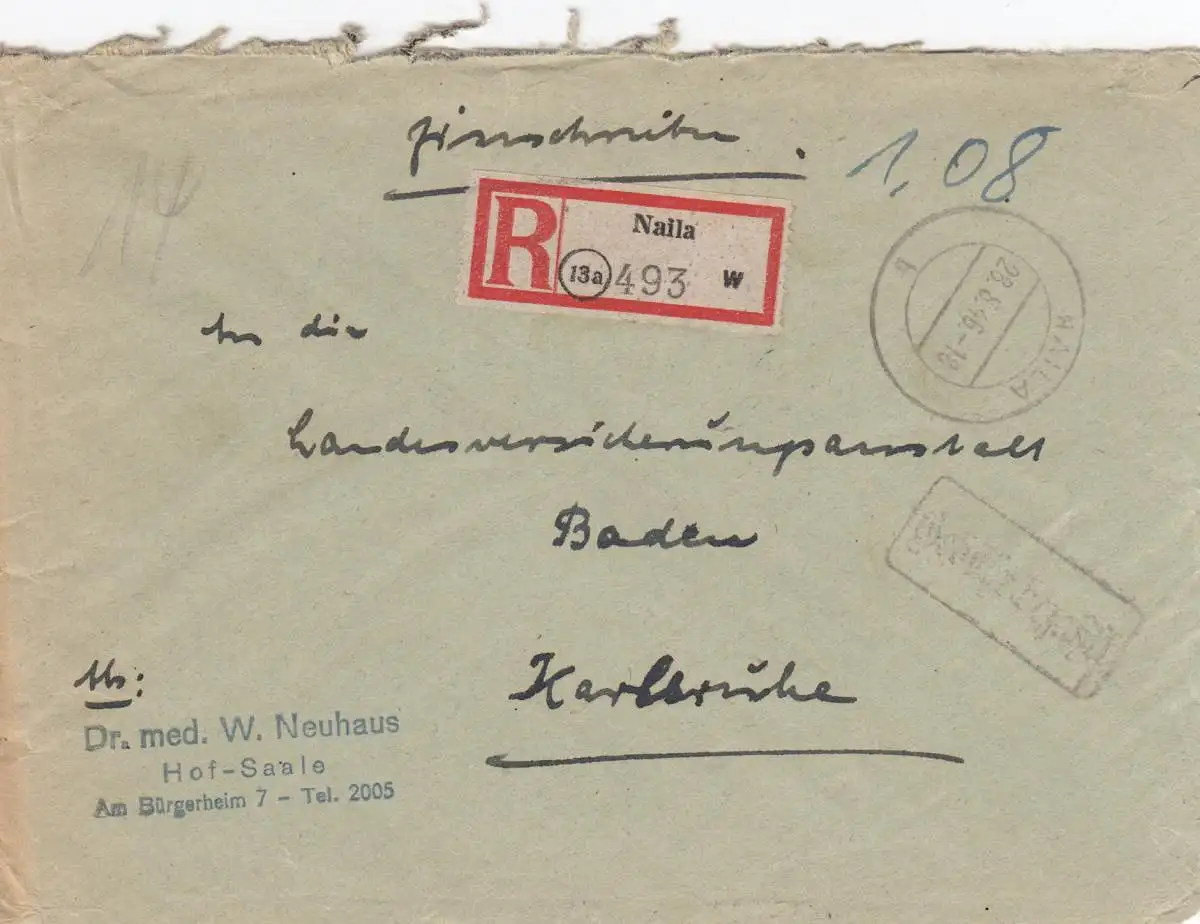 Einschreiben Naila, Gebühr bezahlt 1946 nach Karlsruhe