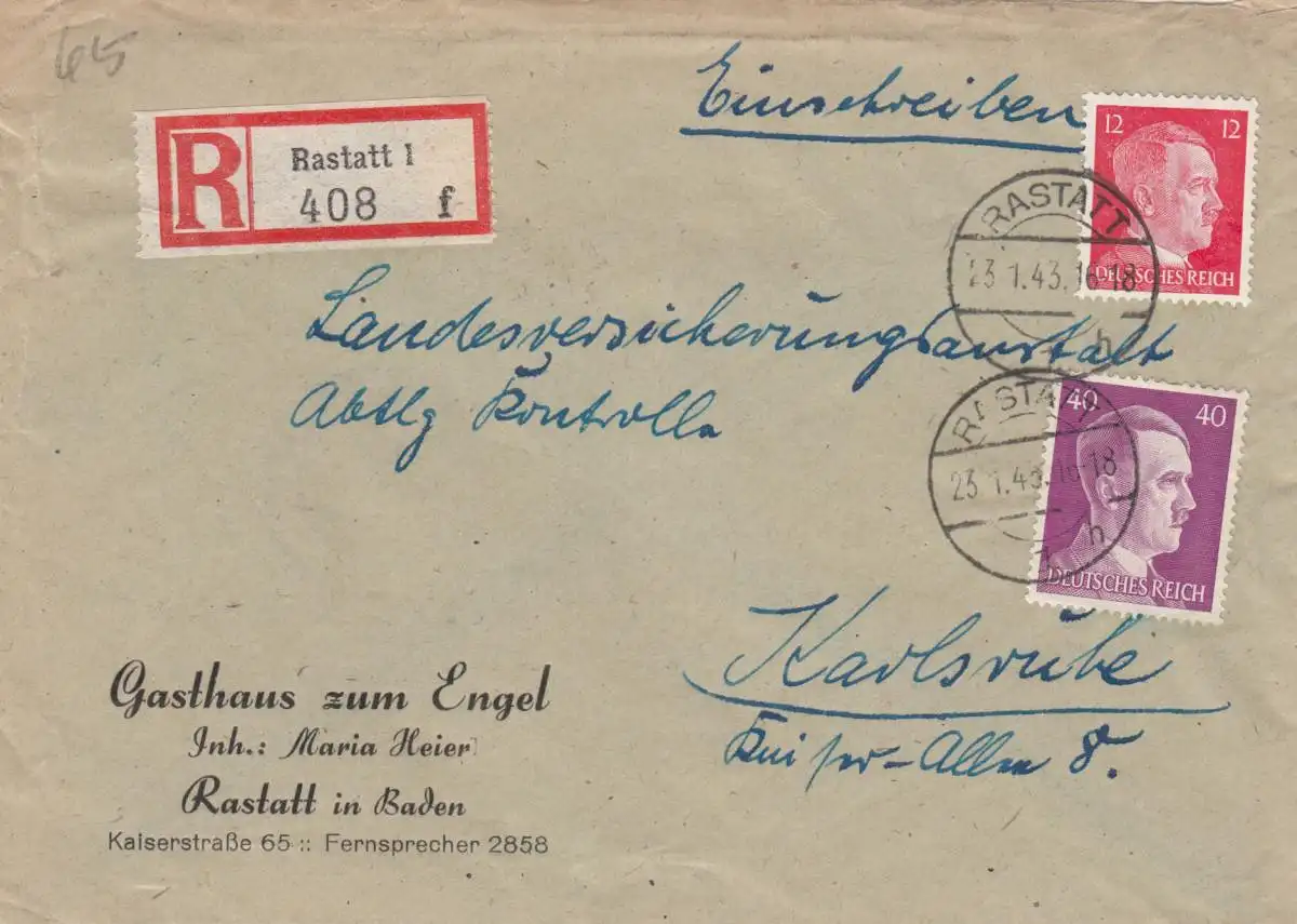 Einschreiben Rastatt 1943, Gasthaus zum Engel nach Karlsruhe