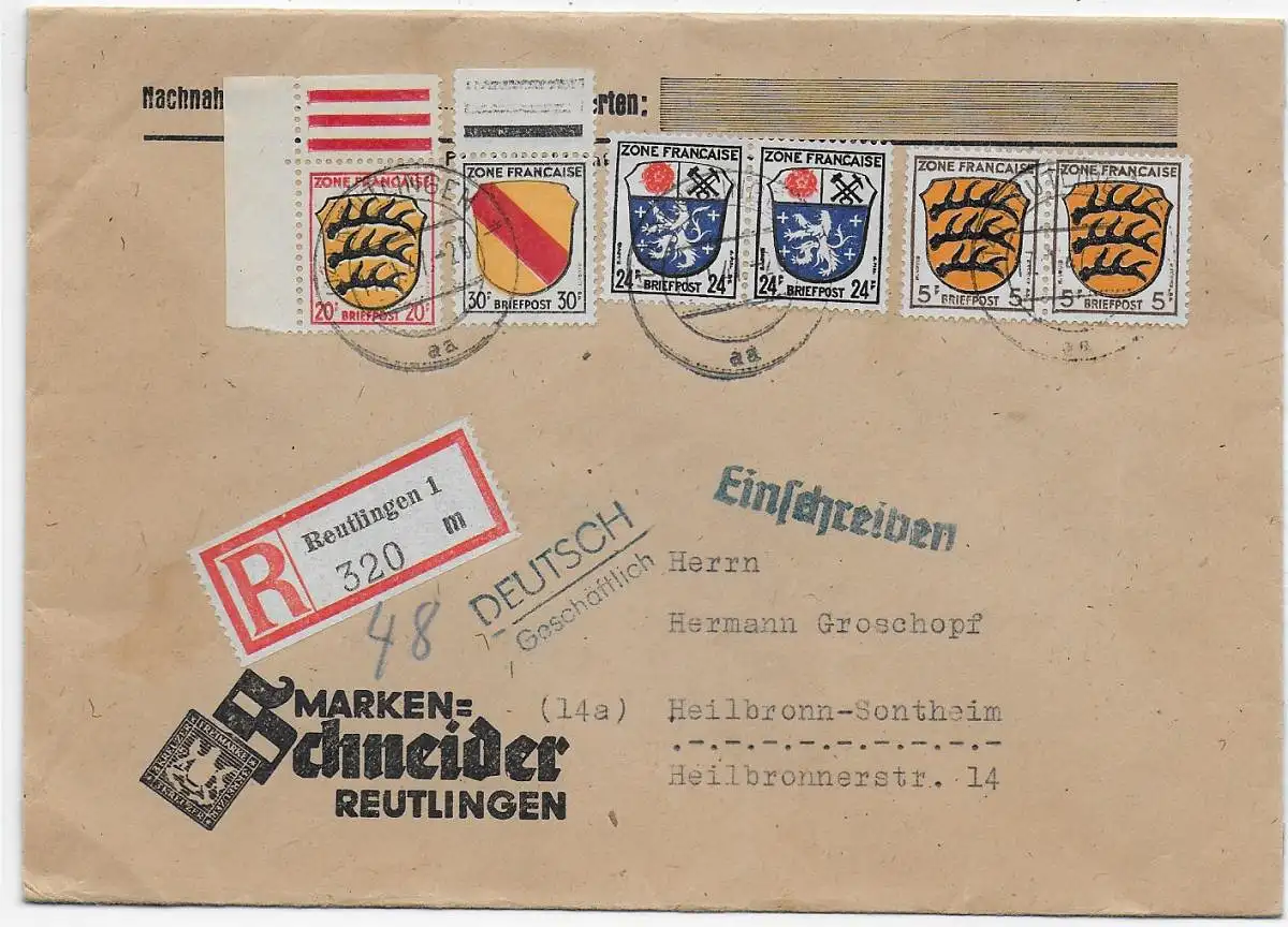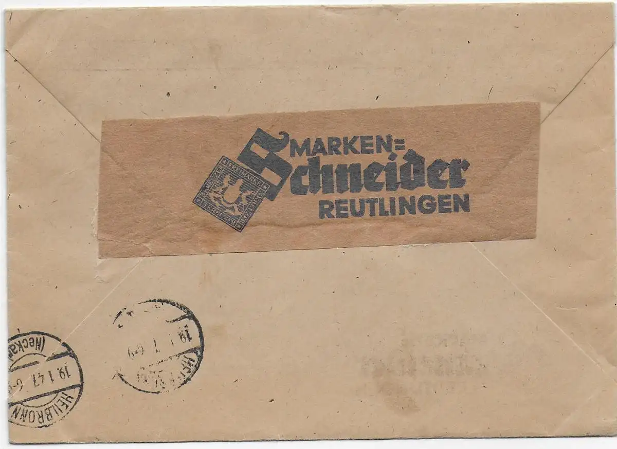 Einschreiben Reutlingen 1947 nach Heilbronn-Sontheim