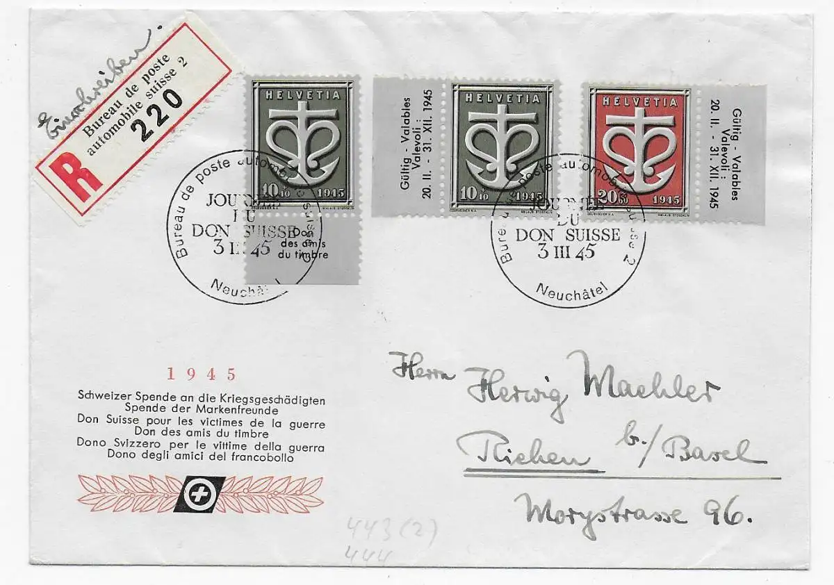 Einschreiben Schweizer Spende an Kriesggeschädigte, 1945 Neuchatel nach Riehen