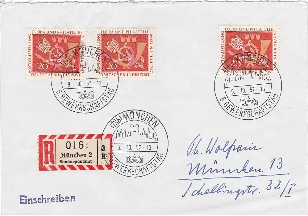 Einschreiben aus München 1957, Sonderstempel 6. Gewerkschaftstag, Sonderpostamt