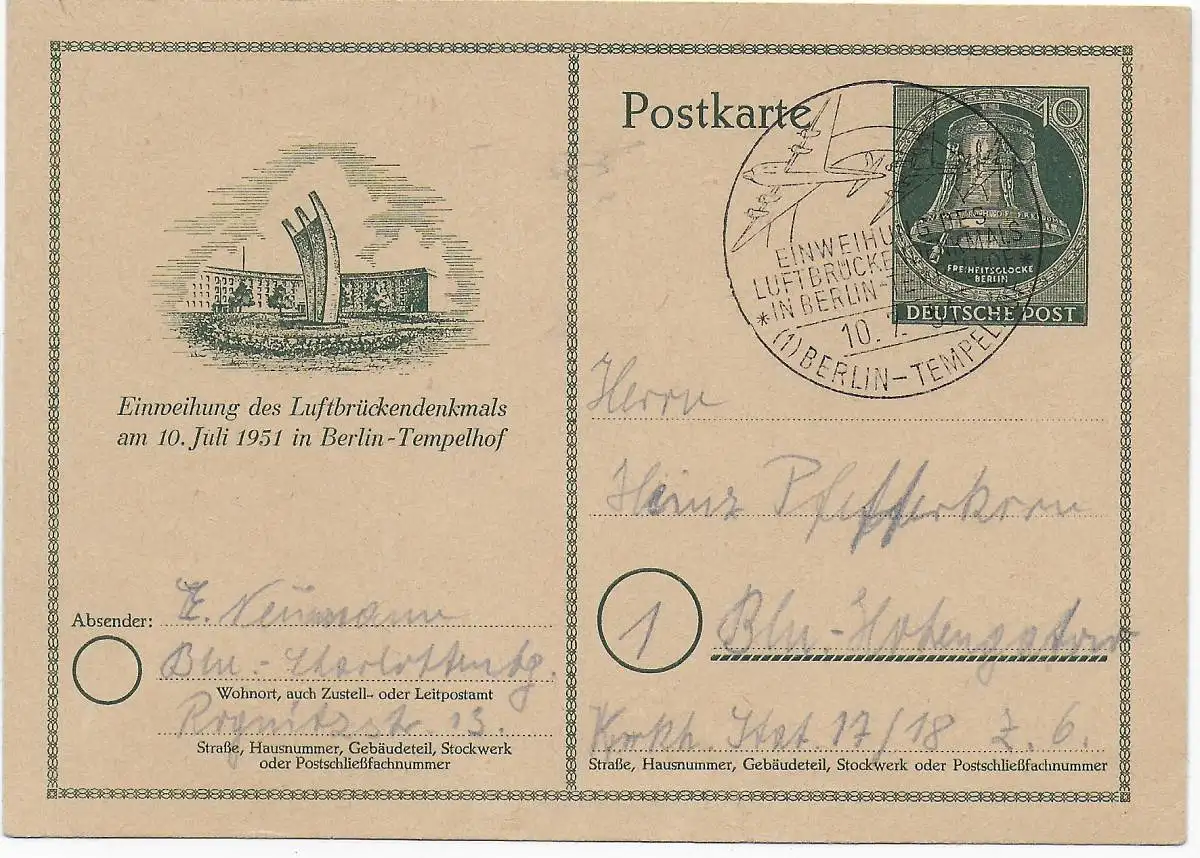 Einweihung Luftbrücke 10.7.1951 Berlin, MiNr. P24