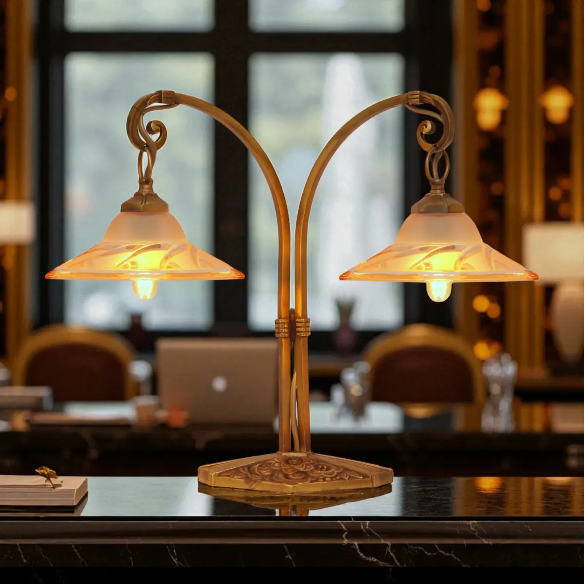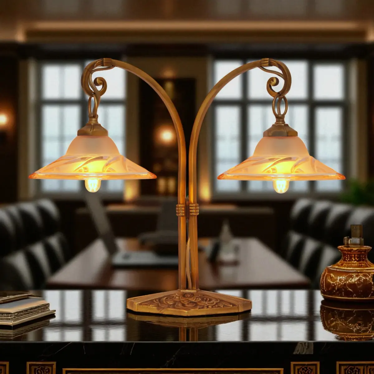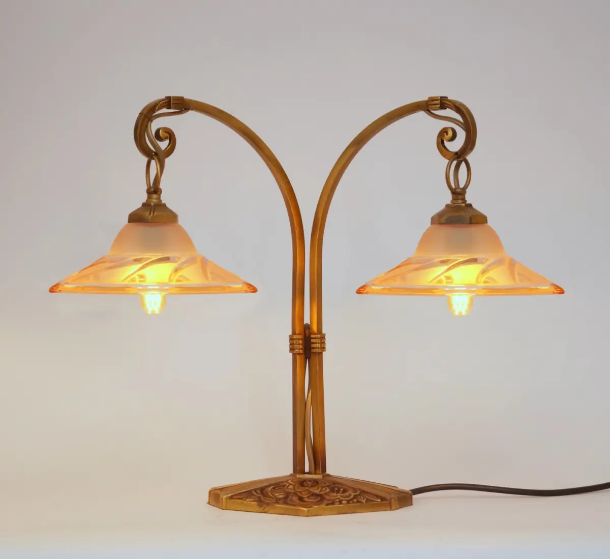 Absolut einzigartige original Design Art Déco Tischleuchte "BLIND SIDE".\nFrankreich, ca. 1920 - 1930.\nWunderschöne original Messing-Montur mit schöner Patina.\nSehr seltene original Art Déco Gussgläser mit einzigartiger Lichtwirkung.\n2 x neue deutsche E14 Standard-Fassung, bis jeweils max. 6 Watt LED-Leuchtmittel.\nZur Sicherheit von Elektrik und Glas empfehlen wir ausschließlich LED-Leuchtmittel zu verwenden.\nMit LED-Leuchtmittel ist wegen fehlender Hitze-Entwicklung auch eine deutlich höhere Lichtausbeute möglich!\nBitte beachten: Wechsel des Leuchtmittels bitte stets nur mit gezogenem Netzstecker bzw. getrennter Stromversorgung!!\nKomplett erneuerte elektrische Installation.\nPVC-Zuleitung (schwarz) mit Schnur-Zwischenschalter.\nGesamthöhe ca. 34 cm, Schirmdurchmesser ca. 13 cm, Gesamtbreite ca. 40 cm.\nZur Sicherheit von Elektrik und Glas empfehlen wir ausschließlich LED-Leuchtmittel zu verwenden.\nMit LED-Leuchtmittel ist wegen fehlender Hitze-Entwicklung auch eine deutlich höhere Lichtausbeute möglich!\nBitte beachten: Wechsel des Leuchtmittels bitte stets nur mit gezogenem Netzstecker bzw. getrennter Stromversorgung!!\nDie Leuchte weist insgesamt deutlich sichtbare Alters- & Gebrauchsspuren auf - dies ist keine neue Lampe!\nKleinteile wie Schrauben oder Unterlegscheiben wurden erneuert.\n
