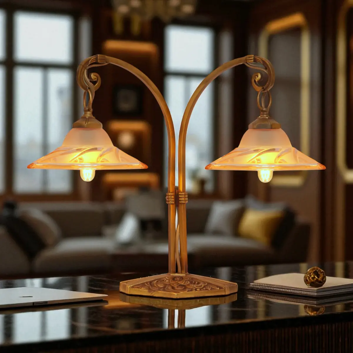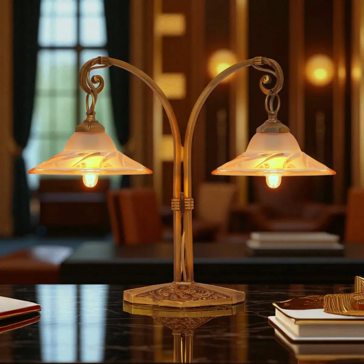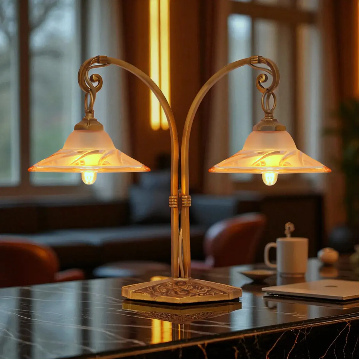 Absolut einzigartige original Design Art Déco Tischleuchte "BLIND SIDE".\nFrankreich, ca. 1920 - 1930.\nWunderschöne original Messing-Montur mit schöner Patina.\nSehr seltene original Art Déco Gussgläser mit einzigartiger Lichtwirkung.\n2 x neue deutsche E14 Standard-Fassung, bis jeweils max. 6 Watt LED-Leuchtmittel.\nZur Sicherheit von Elektrik und Glas empfehlen wir ausschließlich LED-Leuchtmittel zu verwenden.\nMit LED-Leuchtmittel ist wegen fehlender Hitze-Entwicklung auch eine deutlich höhere Lichtausbeute möglich!\nBitte beachten: Wechsel des Leuchtmittels bitte stets nur mit gezogenem Netzstecker bzw. getrennter Stromversorgung!!\nKomplett erneuerte elektrische Installation.\nPVC-Zuleitung (schwarz) mit Schnur-Zwischenschalter.\nGesamthöhe ca. 34 cm, Schirmdurchmesser ca. 13 cm, Gesamtbreite ca. 40 cm.\nZur Sicherheit von Elektrik und Glas empfehlen wir ausschließlich LED-Leuchtmittel zu verwenden.\nMit LED-Leuchtmittel ist wegen fehlender Hitze-Entwicklung auch eine deutlich höhere Lichtausbeute möglich!\nBitte beachten: Wechsel des Leuchtmittels bitte stets nur mit gezogenem Netzstecker bzw. getrennter Stromversorgung!!\nDie Leuchte weist insgesamt deutlich sichtbare Alters- & Gebrauchsspuren auf - dies ist keine neue Lampe!\nKleinteile wie Schrauben oder Unterlegscheiben wurden erneuert.\n